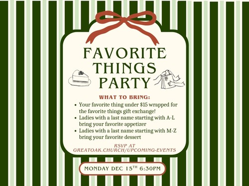 We are so excited to be hosting another women's night here at Great Oak! Join us Monday December 15th for a Favorite Things Party!